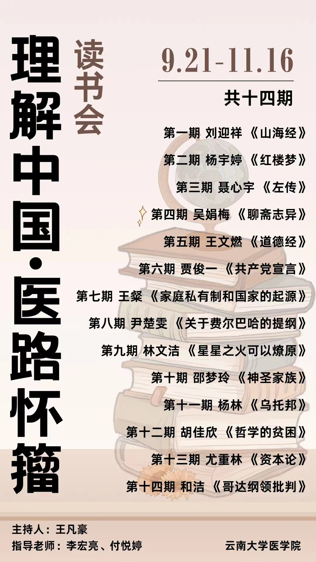 这十四期的分享书目从中华古典书籍到马克思主义著作,跨越上千年,交织了古代、近代、现代的思想。“德不近佛者不可以为医;才不近仙者不可以为医。”我们从古籍中体悟到中华古代优秀思想家们深刻的思考,感受到了中华古典文化的深沉浩瀚;在马克思著作中感受到近现代革命家们激昂的斗志,触摸到了马克思主义思想的先进伟大。而这些都使我们以能在学医的道路上不断武装自己的思想,陶炼自己的品格。