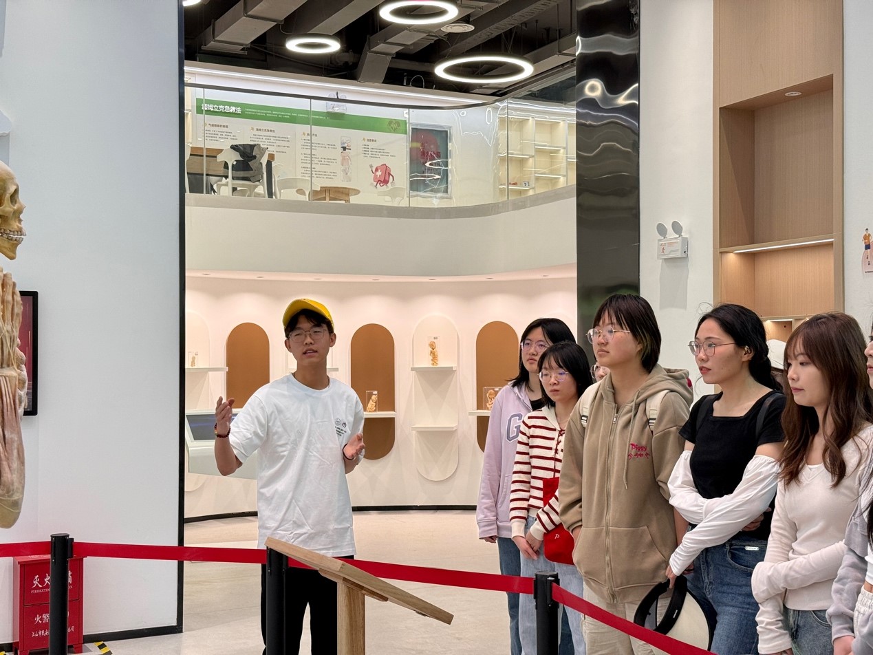 在志愿者引导下,法公司师生参观了生命科学馆序厅、遗体与器官捐献感恩纪念区、生命孕育区、九大人体系统标本展区、人体断层与病理标本展区。馆内陈列的标本不仅展示了人体结构的奥秘,更深刻传递了“大体老师”无私奉献的崇高精神。