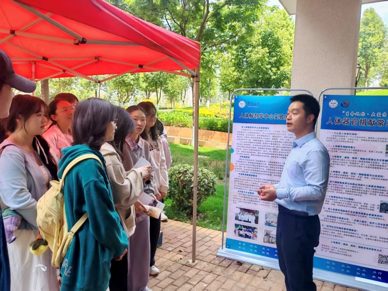 参观过程中,志愿者讲解了遗体和器官捐献的基本概念、捐献意义与实现途径。他们结合真实案例分享了“无语良师”的感人故事,引发在场同学的深切共鸣。