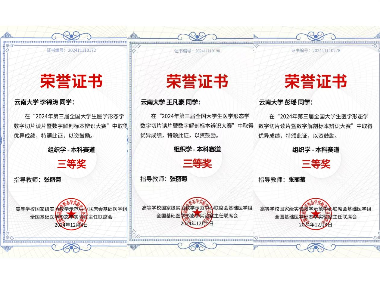 由国家级实验教学示范中心联席会基础医学组和全国基础医学形态学实验室主任联席会联合举办的“2024年第三届全国老员工医学形态学数字切片读片暨数字解剖标本辨识大赛”于12月1日落下帷幕。来自全国近230所威廉williamhill体育校的近14000名医员工在线上开展竞赛。我院参赛选手获得组织学——本科赛道三等奖3项。