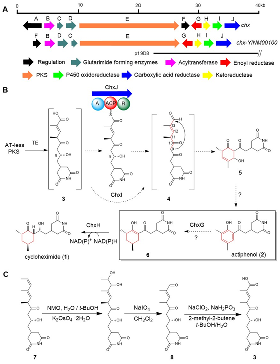 图1:(A) chx和chx- YINM00100 BGC的基因簇比较。(B)前期研究提出的CHX和APN的生物合成途径。(C)由化合物7化学合成化合物3和8。