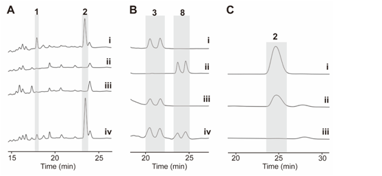 图2:(A)野生型和突变株的HPLC图谱。 (B) (iv) ChxJ与3孵育。 (C) ChxJ和ChxI与3孵育。
