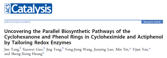 近日,威廉williamhill体育尹敏课题组联合中国科公司昆明植物研究所黄胜雄研究员课题组,在催化领域知名期刊ACS Catalysis上发表了题为“Uncovering the Parallel Biosynthetic Pathways of the Cyclohexanone and Phenol Rings in Cycloheximide and Actiphenol by Tailoring Redox Enzymes”的研究论文。该研究揭示了苯酚和环己酮在相同生物合成机制下形成的一种罕见且不同的级联氧化还原机制,涉及到由羧酸还原酶和CYP450协同催化PKS产物引发的分子内羟醛缩合反应。这一发现扩展了对天然药物分子生物合成中氧化还原酶介导的酚和环己酮基团形成的理解,并为未来的组合生物合成新药研发奠定了基础。近年来,尹敏研究团队以云南本地多种中草药为研究对象,构建了药用植物内生放线菌库,通过多组学联合运用高效发现了系列高潜力菌株,获得了多个活性新天然产物,进而开展了生物合成机制的研究。