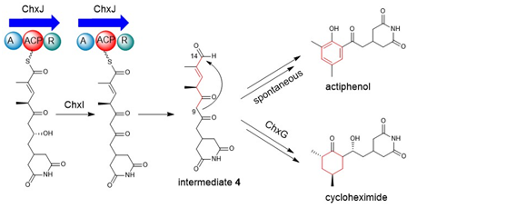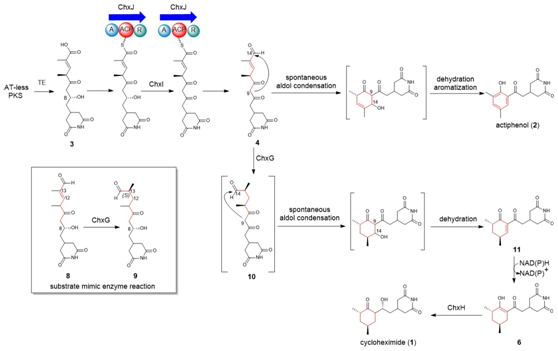 至此,CHX和APN的生物合成途径的细节,包括六元碳环系统的生物合成的新机制得到了完整解析。本研究表明,CHX和APN并非如先前推测的那样由APN催化氢化产生CHX,而是自trans-AT PKS合成了碳骨架后,通过两个平行的途径分别产生的。两种氧化还原酶(ChxJ和ChxI)可以单独产生一种活性中间体,该中间体经历一系列非酶转化以产生APN,而还原酶(ChxG)则作为看门人,将同一中间体引导到产生CHX的合成途径。该研究对作者团队于2014年提出的假设(Yin et al. Org Lett, 2014)进行了进一步修正,扩展了对天然产物生物合成中氧化还原酶介导的酚和环己酮基团形成的理解,并为未来的组合生物合成研究奠定了基础。