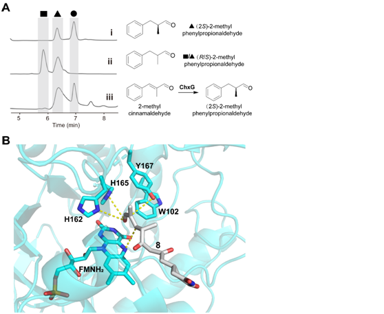 图5:(A) 手性HPLC图谱。 (B)化合物8与ChxG活性口袋对接。