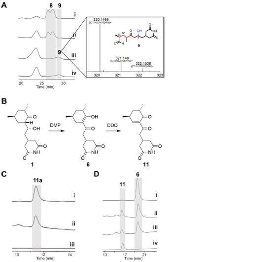 图3:ChxG的体外酶促反应。(A)ChxG化合物8生成9。 (B)由化合物1(CHX)化学合成化合物11和6。(C) ChxI、ChxJ和ChxG与3孵育,11易于发生酮烯醇互变异构生成11a。(D) NADPH在添加或不添加ChxG的情况下分别与11共孵育。