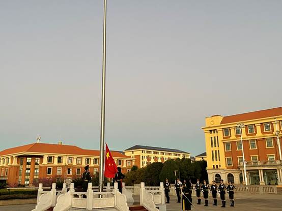 上午7:30分正,国旗护卫队同学护卫着国旗,迈着铿锵的步伐,阔步走到国旗台前,伴着洪亮的《义勇军进行曲》的唱响,国旗在微风中冉冉升起,全体同学向国旗庄严肃穆敬礼。随着国歌音乐的结束,鲜艳的五星红旗在文典广场的上空随风飘扬,在晨光的照耀下绽放出无比绚烂的中国红。