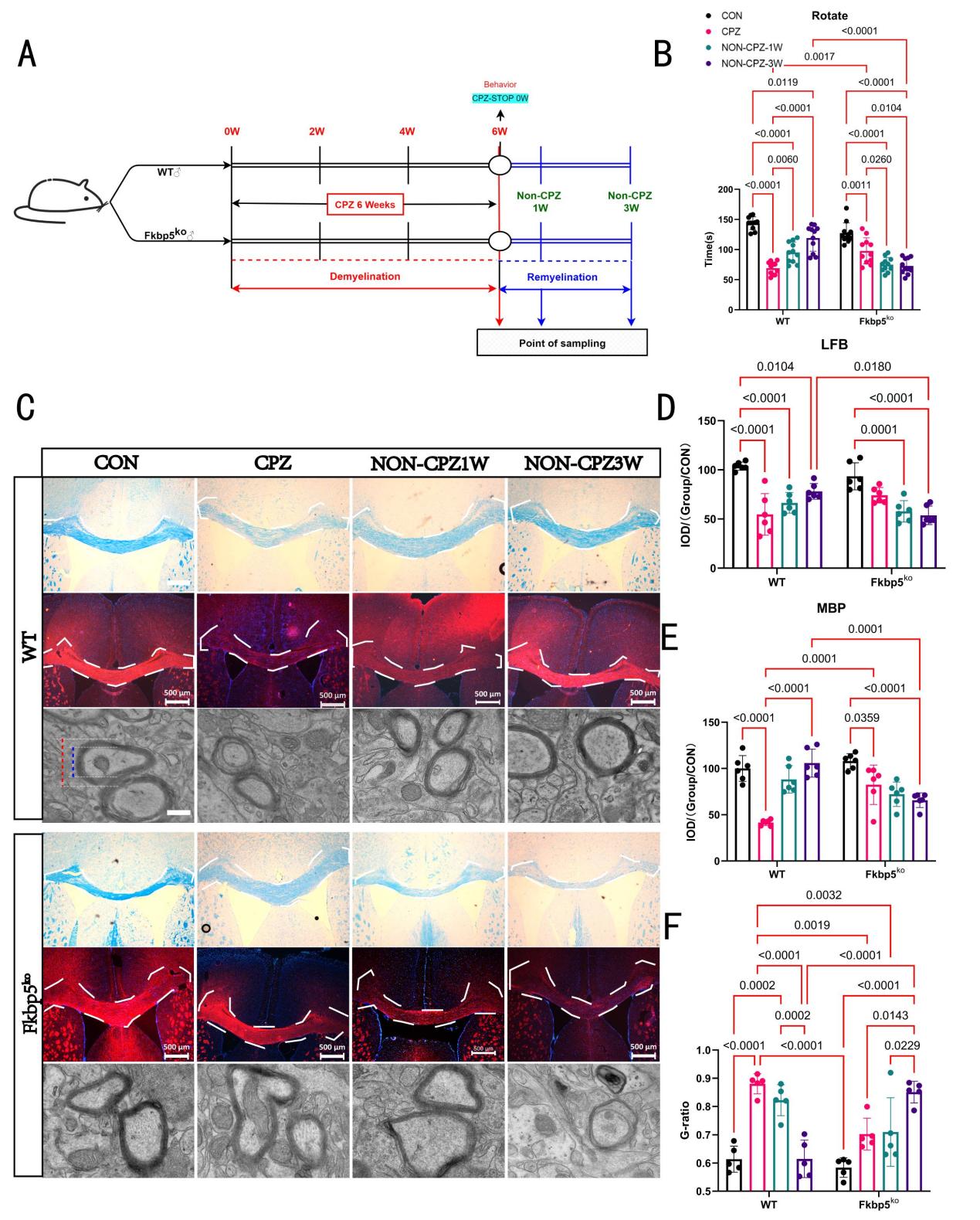 图1.(A)脱髓鞘和再髓化动物模型构建流程图、(B)动物转棒行为学统计、(C)胼胝体及周围组织区域的LFB染色、MBP荧光染色和透射电镜观察髓鞘的动态变化、(D和E)LFB、MBP的IOD统计、(F)G-ratio统计。