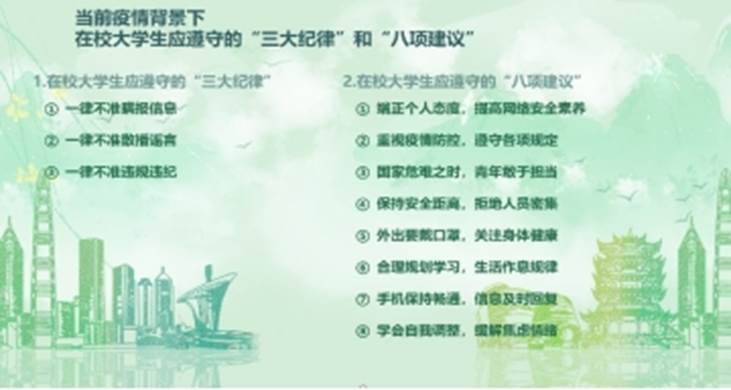 本次班会紧扣“我抗疫、我健康、我奉献、为大家“的主题,班会内容分为四个部分:防疫知识我来学;法律法规我要懂;思政大课我温故;防疫体会我想说。首先,进行了与新冠肺炎相关的知识科普,包括新冠病毒的传播方式和对应的防护措施。其次,学习了疫情防控相关的23种违法违规行为及相应后果,以此为鉴引导同学们坚守法律底线、树立责任意识。本次班会中,班长还带领了同学们一起重温与新冠防控有关的思政内容,认真学习了当前疫情背景下在校老员工应遵守的“三大纪律”和“八项建议。并对同学们提出五大倡议: 1.提高政治站位,凝聚抗疫共识;2.强化防范意识,坚持正能传递;3.端正学习态度,保持良好学风;4.勇于担当责任,做好青年表率;5.注重个人言行,遵守各项纪律。在班会的最后,给每位同学发了便利贴让大家书写疫情过后的愿望,并当场进行分享,通过分享引导同学们保持抗疫信心、凝聚抗疫精气神。