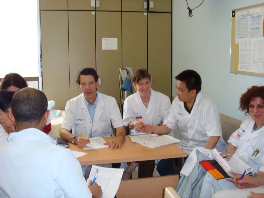 韦嘉(右2)在法国国家医学与健康研究所巴黎Bichat医院临床研究中心担任外籍研究员时和法国同事讨论工作