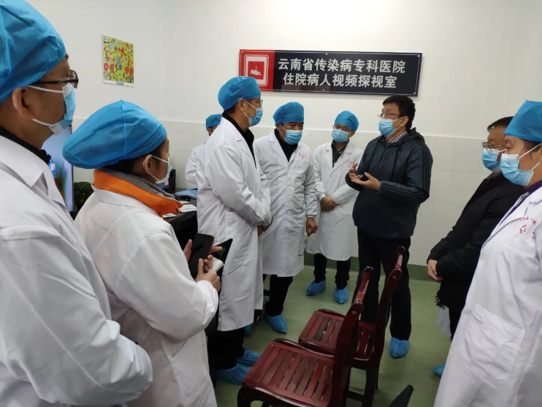 韦嘉(右三)率专家组在云南省传染病医院和医护人员讨论新冠病人救治工作